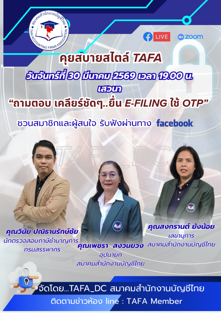 ใหม่! 02 Apr กิจกรรมสมาคม สรุปเสวนา TAFA: เคลียร์ชัดปม ‘ยื่น e-Filing ใช้ OTP’ แนะผู้ประกอบการ-สำนักงานบัญชีรีบอัปเดตข้อมูลก่อนดีเดย์ 28 เม.ย. นี้ สมาคมสำนักงานบัญชีไทย โดย TAFA จัดเสวนาออนไลน์ถามตอบ เคลียร์ชัดๆ ยื่น E-FILING ใช้ OTP เตรียมรับมือระบบบังคับ 28 เมษายน 2569 อ่านต่อ 10 · 7 days ago